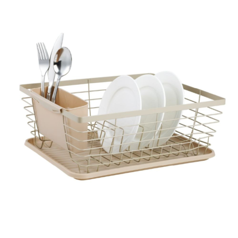 Kinghoff edényszárító kosár fémből, homokbézs színű porfestéssel. Tartós fém konstrukció lágy porfestéssel az edények védelméért, valamint egy alsó csepegtető tálcával. A kosár része egy leválasztható evőeszköz szárító. Mosogatógépi tisztítása nem javasol