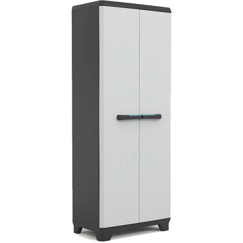 Kerti tároló szekrény - műanyag, lábakkal, lehajtható felület, 3 polcos, polc terhelhetősége 15 kg, mérete 173 × 68 × 39 cm (Ma×Sz×Mé), tömege 12 kg, fehér és fekete kivitel A profi KIS műanyag kerti tároló szekrény ideális szerszámok, kerti szerszámok vagy tisztítószerek tárolására. Rendelkezik egy olyan tárolóterülettel is, amely munkaterületként szolgál is különféle fe