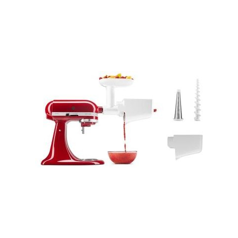 Gyümölcsprés - a KitchenAid konyhai robotgéphez, praktikus készlet finom hús-, zöldség- és gyümölcsételek készítéséhez, a szett minden részét könnyedén csatlakoztathatod a robot többcélú szorítófejéhez, a kiegészítők két fő funkciót kínálnak: a hozzávalók őrlése, valamint a gyümölcsök és zöldségek sajtolása, a következő modellekkel kompatibilis: MINI 5KSM3311, Artisan 5KSM45, 5KSM90, 5KSM125, 5KSM150, 5KSM156, 5KSM175, 5KSM180, 5KSM185, Heavy Duty /