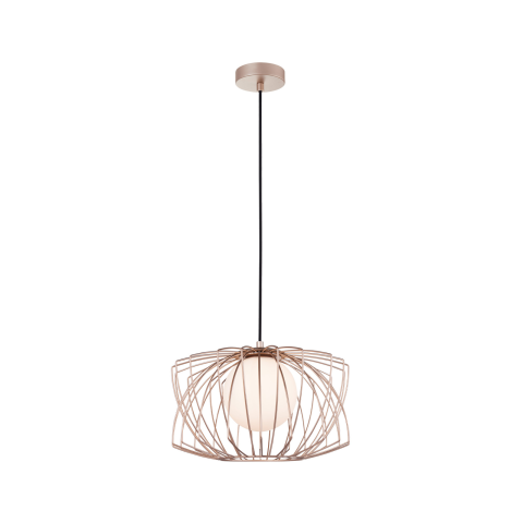 A GEOMETRIC függesztett lámpa modern, mégis légies formavilágával különleges hangulatot teremt bármely térben. A rozéarany színű, geometrikus fémrács szerkezet elegánsan öleli körül az opálos üvegbúrát, amely lágyan szórja a fényt. G9 foglalattal rendelke..