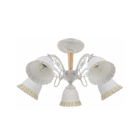 MERIDA mennyezeti lámpa klasszikus és romantikus stílusban készült, amely fehér-arany színeivel és natúr fa részleteivel elegáns, mégis otthonos hangulatot áraszt. A lámpabúrák különleges fodros pereme egyedi megjelenést kölcsönöz, így a lámpa igazi dísze..