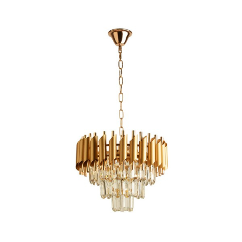 A MIRRAGE függesztett lámpa elegáns és luxus megjelenést kölcsönöz bármely térnek. Az aranyszínű fém vázat látványos, függő üvegelemek díszítik, amelyek ragyogó fényhatást keltenek. Az E14-es foglalat klasszikus izzókkal és modern LED-ekkel egyaránt kompa..