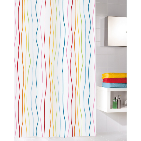 Zuhanyfüggöny számos előnnyel: a kiváló minőségű Kleine Wolke Jolie zuhanyfüggönnyel néhány lépésben szebbé teheti fürdőszobáját, egyedi kiemeléseket alkalmazhat és kiváló belátás- és fröccsenés elleni védelmet hozhat létre a zuhanyzó vagy a fürdőkád területén. A modern kialakítás színes, a fehér alapon játékosan és vidáman kígyózó csíkokkal győz meg. A textilanyag megmunkálása kiváló minőségű, ápolása könnyű. A felhasznált fonalak é