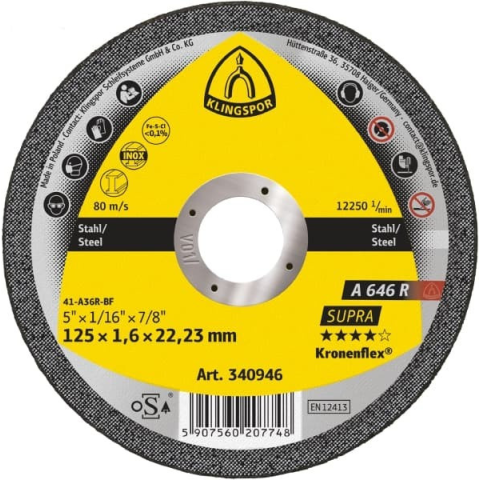 Klingspor A 646 R Supra vágókorong: Acél és nemesacél vágásához ⚙️ Ez a kiváló minőségű Klingspor Kronenflex vágókorong ideális választás acél és nemesacél precíz vágásához. A 125 mm átmérőjű korong széles körben alkalmazható, és kompatibilis a legtö...