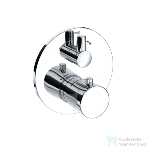 falsík alatti termosztátos 2 funkciós csaptelep falon kívüli készlet szabályzóegységgel, előlappal kerámia zárószeleppel és váltószeleppel két fogyasztó számára hengeres fogantyú, fém 38 ˚C−ra beállított retesszel névleges vízmennyiség: 20 l/perc, 3 bar