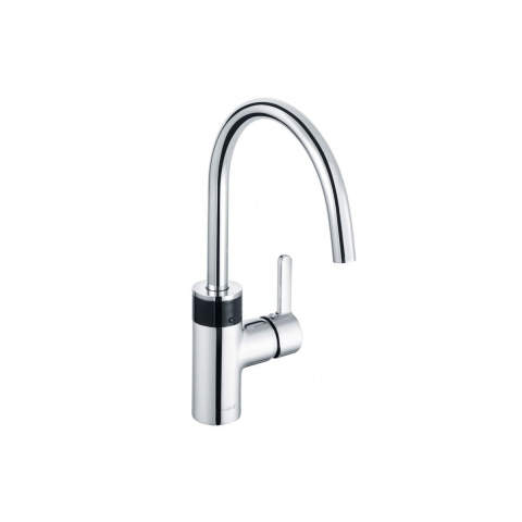 Érzékelős állványos mosogatócsaptelep forgatható karral. Króm kivitelben. A csaptelep magassága 37,5 cm.