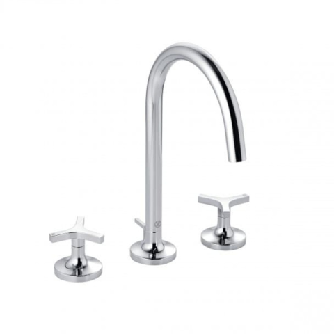 Termékjellemzők: Csillagfogantyúk Háromlyukas szerelés Kerámia felsőrész 90° Soft-Start Névleges vízmennyiség: 5,6 l/perc, 3 bar nyomáson Flexibilis csatlakozás G 3/8 Talpas kivitel Lefolyógarnitúra G 1 1/4 fémből