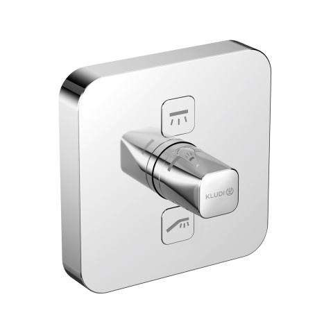 nyomógombos vezérlés két vízvételi lehetőséggel kerámia vezérlőegység állítható hőfokkorlátozóval hőmérséklet-szabályozás a kar elfordításával fém lekerekített rozetta Kludi Push szögletes falsík alatti kád és zuhany csaptelep króm Kényelem és Eleganc