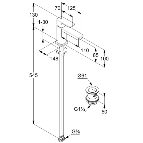 egylyukas szerelési mód teli fogantyú PCA Caché perlátor M 18,5 kerámia vezérlőegység állítható hőfokkorlátozóval EcoPlus hideg víz középállásnál névleges vízmennyiség: 5 l/perc, 3 bar nyomáson rugalmas nyomótömlők G 3/8 DVGW jóváhagyással gyors rögzítő r