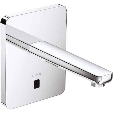 Csz: 3850205 KLUDI ZENTA SL E elektronikus mosdócsap látható rész lekerekített rozetta áramellátás 230 V hálózati áramról vagy 6 V lítium elemmel falra szerelhető kivitel vízsugárszabályzó M 24 x 1 névleges vízmennyiség 5 l/perc 3 bar nyomáson optika