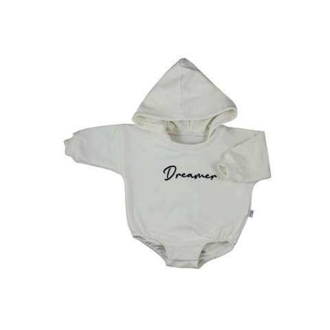 Baba ötletes hosszú ujjú body kapucnival Koala Dreamer. A body az ülepénél patentos, ami megkönnyíti a baba öltöztetését és pelenkázását. A nyak körül rugalmas szegély található a könnyű felöltözés érdekében a fejen keresztül. Dreamer felirattal rendelkez