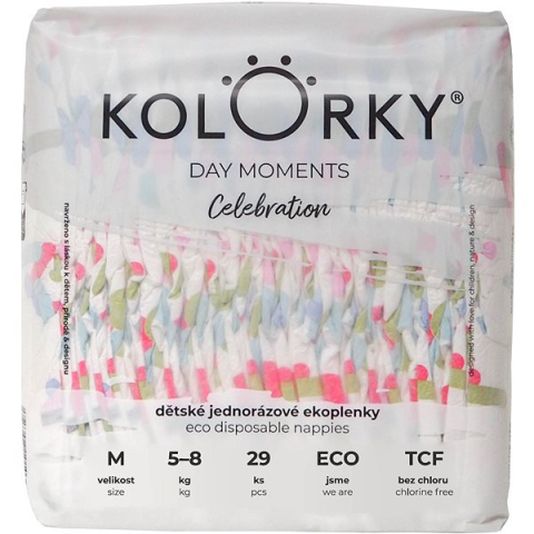 Eldobható pelenka - öko pelenka és hagyományos pelenka, méret M, gyermek súlya 5 - 8 kg, 29 darab a csomagban, nedvességjelző, parfümmentes és klórmentes, anyaga nem szőtt textília, formákkal díszített motívum, Kolorky Day sorozat Gyermekednek száraznak kell éreznie magát, hogy elégedett legyen. A hagyományos kialakítású Kolorky pelenka a minőségi Kolorky Day sorozatból nem fogja korlátozni a kisbabát és megadja neki a szüksége