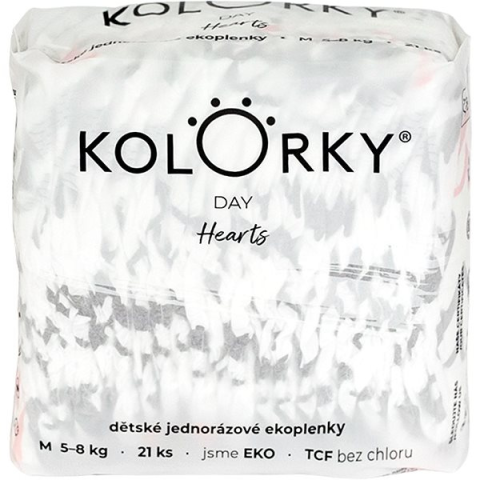 Eldobható pelenka - öko pelenka és hagyományos pelenka, méret M, gyermek súlya 5 - 8 kg, 21 darab a csomagban, pelenkakiütés elleni védelem, rugalmas szalag, parfümmentes és klórmentes, szívvel díszített motívum, Kolorky Day sorozat Gyermeked elégedettségével szorosan összefügg a szárazság érzése. A hagyományos fajtájú Kolorky eldobható pelenka a kiváló Kolorky Day sorozatból nem fogja korlátozni a kisbabát és biztosítja neki a s