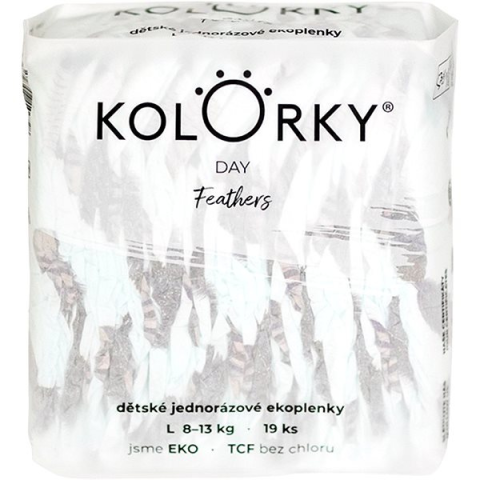 Eldobható pelenka - öko pelenka és hagyományos pelenka, méret L, gyermek súlya 8 - 13 kg, 19 darab a csomagban, pelenkakiütés elleni védelem, rugalmas szalag, parfümmentes és klórmentes, Kolorky Day sorozat Gyermeked csakis szárazon fogja elégedettnek érezni magát. A hagyományos dizájnú Kolorky eldobható pelenka a nagyszerű Kolorky Day sorozatból nem fogja zavarni a kisbabát és biztosítja neki a szüksége