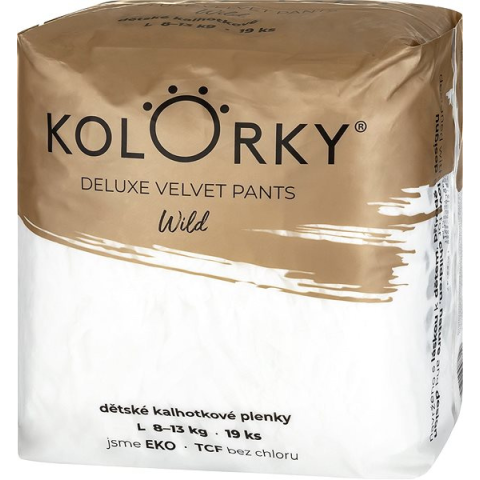 Bugyipelenka - környezetbarát, eldobható, mérete L, 8-13 kg súlyú gyermekek számára, nedvességjelző, ergonómikus abszorbens mag, pelenkakiütés elleni védelem, rugalmas szalag, parfümmentes, klórmentes, 19 db a csomagban Szeretnéd, ha kisbabád még pelenkában is jól érezné magát? Akkor biztosan hasznosnak fogod találni a környezetbarát KOLORKY DELUXE VELVET PANTS - wild - L-es méretű (8-13 kg) környezetbarát pelenkát.