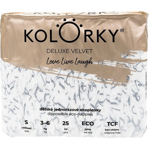 Eldobható pelenka - öko pelenka és hagyományos pelenka, méret S, gyermek súlya 3 - 6 kg, 25 darab a csomagban, nedvességjelző, pelenkakiütés elleni védelem, rugalmas szalag, extra légáteresztő, parfümmentes és klórmentes, betűkkel díszített motívum, Kolorky Deluxe sorozat Gyermeked csakis szárazon fogja elégedettnek érezni magát. A hagyományos dizájnú Kolorky pelenka a remek Kolorky Deluxe sorozatból nem fogja korlátozni a kisbabát és biztosítja neki a szüksége