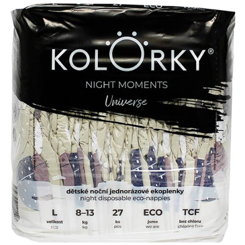 Eldobható pelenka - hagyományos pelenka és éjszakai, méret L, gyermek súlya 8 - 13 kg, 27 darab a csomagban, nedvességfelszívó csatornák, nedvességjelző, pelenkakiütés elleni védelem, rugalmas szalag, parfümmentes és klórmentes, anyaga elasztán és nem szőtt textília, állatkás motívum, Kolorky Night sorozat Gyermeked csakis szárazon fogja elégedettnek érezni magát. A hagyományos fajtájú Kolorky eldobható pelenka a remek Kolorky Night sorozatból nem fogja korláto