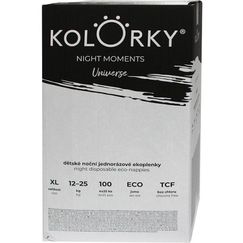Eldobható pelenka - öko pelenka, hagyományos pelenka és éjszakai, méret XL, gyermek súlya 12 - 25 kg, 100 darab a csomagban, nedvességfelszívó csatornák, nedvességjelző és klórmentes, anyaga elasztán, fluff pulp és nem szőtt textília, világűr motívum, Kolorky Night sorozat Gyermekednek szüksége van a szárazság érzésére, hogy elégedett legyen. A hagyományos fajtájú Kolorky eldobható pelenka a nagyszerű Kolorky Night sorozatból nem fogja korlátozni a kisbabát