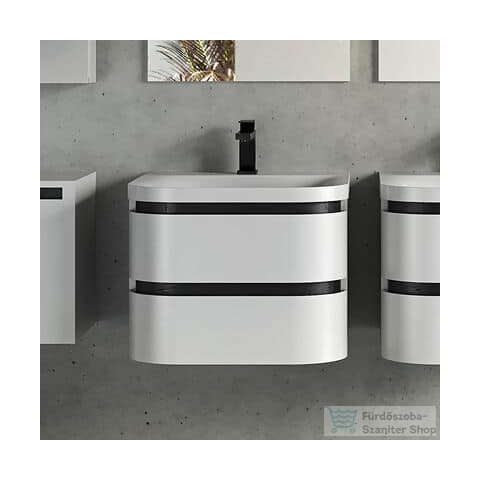Lekerekített szélű bútorcsalád öntött márvány mosdóval. Bemart fogantyúi mögött a fekete sáv sztenderd, így szépen illeszkedik a fekete profilú kabinokhoz és kiegészítőkhöz. Frontjait és korpuszát illetően három divatos színben rendelhető, a fiókrendező s