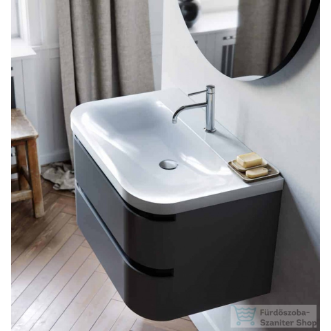 Lekerekített szélű bútorcsalád öntött márvány mosdóval. Bemart fogantyúi mögött a fekete sáv sztenderd, így szépen illeszkedik a fekete profilú kabinokhoz és kiegészítőkhöz. Frontjait és korpuszát illetően három divatos színben rendelhető, a fiókrendező s