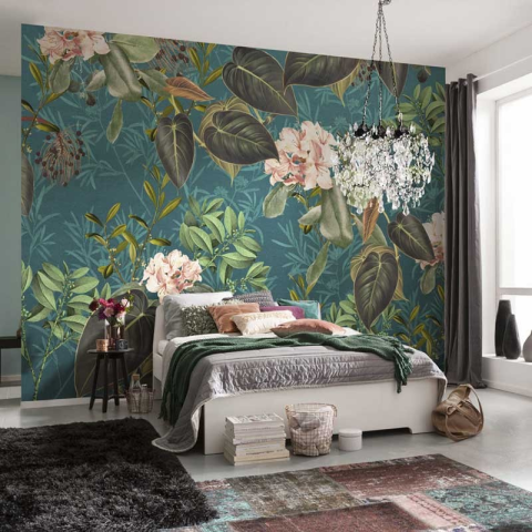 Jacinta fotótapéta - Trópusi levél és virágmintás vlies tapéta A kép 350 cm széles és 250 cm magas. 7 részből áll. Ajándék ragasztóval szállítjuk.