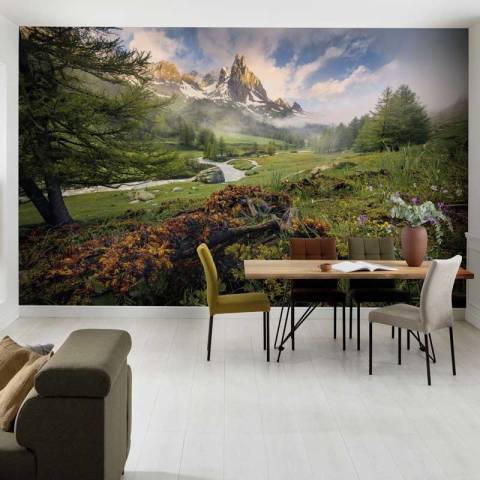 Morning Walk fotótapéta - Hegy és erdő a patak partján mintás tapéta A kép 368 cm széles és 254 cm magas. ( 8 részes, egyenként 92 x 127 cm-es darabból áll ) Ajándék ragasztóval szállítjuk.