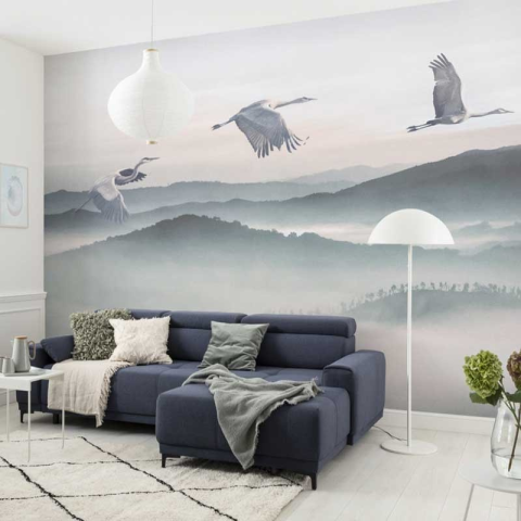 A „Madártávlat” fotótapéta egy varázslatos, légies világba repít. A sejtelmes ködbe burkolózó hegyvonulatok és a szabadon szárnyaló darumadarak látványa különleges térérzetet teremt, mintha a magasból tekintenél le a tájra. Ez a természet ihlette tapéta i