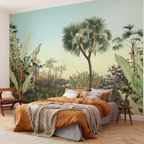 Oasis fotótapéta - Pálmafa mintás trendi fali poszter A kép 7 részes - 350 cm széles és 250 cm magas. Egyszerű felrakni. Elég a falat ragasztózni, ezáltal gyorsabb és tisztább a kivitelezés folyamata.