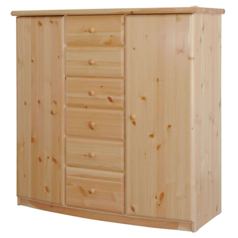 Csanád Íves Komód: Elegáns tárolás tömör fából 🏡 Ez a gyönyörű Csanád íves komód tömör borovi fenyőből készült, így masszív és tartós.  Két praktikus ajtó és hat tágas fiók kínál bőséges tárolóhelyet ruháinak, kiegészítőinek és egyéb holmijának. Az í...