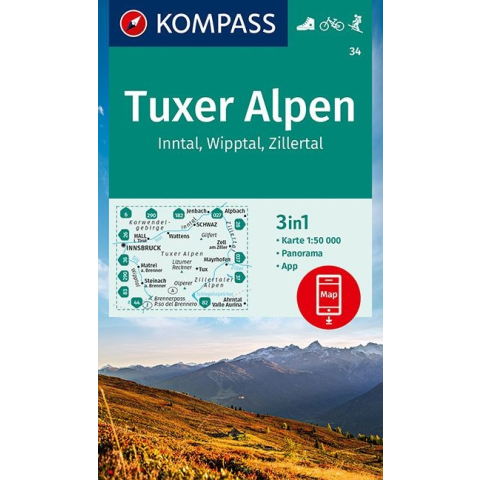 A Tux-Alpok, Inntal, Wipptal, Zillertal KOMPASS túra térképe 34. Tuxer Alpen, Inntal, Wipptal, Zillertal turista térkép Kompass