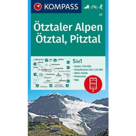 KK 43 Ötztaler Alpen, Ötztal Alpok turistatérkép, Pitztal túra-, sí- és kerékpáros térkép Ötztal, Pitztal Alpok térkép 43. Ötztaler Alpen, Ötztal, Pitztal turista térkép Kompass turistatérkép, kerékpáros térkép