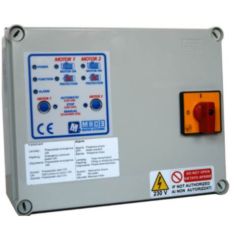 Szárazon futás elleni, valamint amperometrikus védelmet biztosít biztosít a szivattyú motorjának. Egyvagy két szivattyút vezérel akár egyszerre*. A vezérlést a belső elektronikus áramkör látja el. A szivattyúk indításáról egy nyomás– vagy úszókapcsoló, vagy érzékelőszondák gondoskodnak, amelyek a vezérlőszekrényre vannak kötve.
