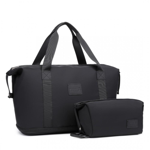 Kono kétrészes fekete, kiváló minőségű utazótáska szett strapabíró és vízálló nejlonból készült, így tökéletes választás minden utazáshoz, esős időben is. A táska alján található cipzárral bővíthető a kapacitása, ideális extra tárgyak hazaszállítására. Nagy kapacitású fő cipzáras zsebbel, nedves és száraz rekeszekkel, két belső zsebbel rendelkezik a telefon, kulcsok és egyéb tárgyak számára. Hátsó pánt biztosítja a bőrönd fogantyújár