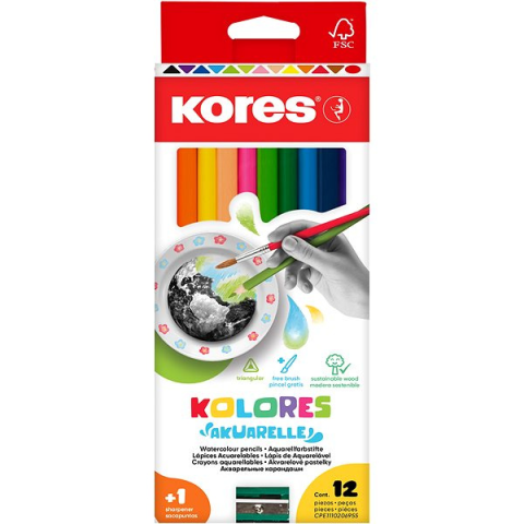 Színes ceruza KORES - akvarell, háromszögű, jobb- és balkezes, ergonomikus markolat, papír felületekre, hagyományos színek, puha ceruzabél, papír csomagolás, hegyező, ecset és 12 ceruza a csomagban Kolores Akuarelle akvarell színes ceruzákA Kores Kolores Akuarelle akvarell színes ceruzák fő jellemzője, hogy reagálnak a vízzel. Amint a ceruzával rajzolsz a papírra, a mellékelt ecsettel vizet vihe