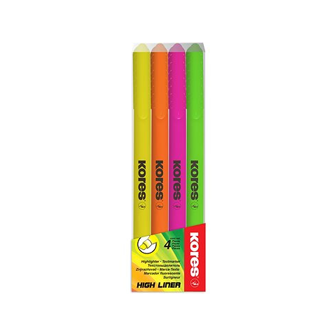 Szövegkiemelő otthoni és irodai használatra, vágott hegyű, max. 3,5 mm vonalvastagság, 4 db-os csomag, narancssárga, rózsaszín, zöld, sárga színben A szövegkiemelők olyan hasznos írószerek, amelyek szinte minden irodában és háztartásban megtalálhatók. A megbízható KORES szövegkiemelő használatával sosem fogjuk szem elől téveszteni a fontos iratok