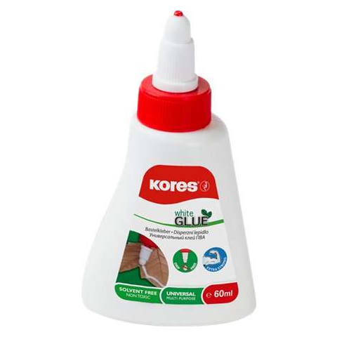 Hobbiragasztó, 60 ml, KORES White Glue - fehér PVA alapú hobbiragasztó - adagolós kupak - tiszta és könnyű használat - egyenetlen felületekre is alkalmas - ideális hobbi és kreatív tevékenységekhez - száradási idő: 2 perc - vízzel mosható - oldószermen