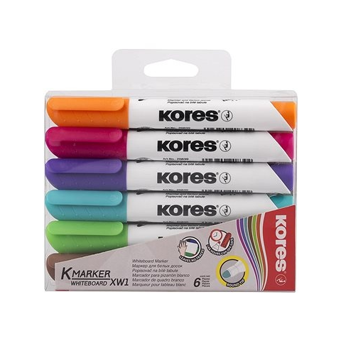 Marker - használható tábla felületeken, tinta, gyorsan száradó, hegy formája kerek, 3 mm vonalvastagság, kerek markolat, kosár és 6 filc a csomagban Tábla- és flipchart marker készletA KORES marker készlet tökéletes választás a mindennapi irodai vagy iskolai munkához. Mindig lesz kéznél marker, amelyet a fehér táblákon és a flipchartokon használha