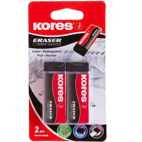 Radír - ceruza és zsírkréta radírozásához, fekete kivitel, 2 darabos csomag, mérete 10 × 60 × 21 mm (Ma×Sz×Mé) Guma KORES KE20 představuje praktický doplněk do každého školního penálu, kanceláře i domácnosti. Zajistí jemné a čisté gumování a spolehlivě vygumuje text napsaný či obrázek nakreslený tužkou