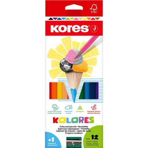Színes ceruza KORES - háromszögű, jobb- és balkezes, ergonomikus markolat, papír felületekre, hagyományos színek, puha ceruzabél 3 mm átmérővel, papír csomagolás, hegyező és 12 ceruza a csomagban Egy ilyen KORES színes ceruza a lélek ecsete, amellyel korlátok nélkül kifejezhetjük egyéniségünket és egyediségünket. Háromszög formája nagyban hozzájárul kényelmes használatához. Ez a legkisebbeknek
