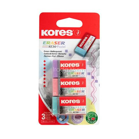 Radír, KORES KE-30, 3 pasztell szín PVC radír trendi pasztell színekben -puha és tiszta radírozás, nem morzsolódik -nem maszatol -ideális iskolai, otthoni és irodai használatra -3 db-os bliszteres csomagolás -3 különböző szín -méret: 40 x 21 x 10 mm