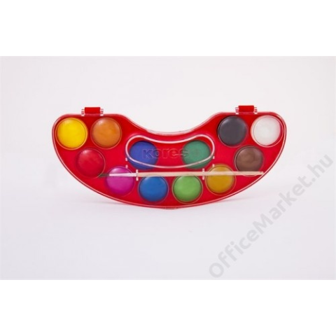 Vízfesték, 12 darabos, 30 mm, KORES Aquarellos (IK30102) 12 féle élénk, intenzív szín ideális iskolába vagy otthoni kreatív tevékenységhez egyedi dizájn: kinyitva palettaként tartható praktikus fedél melyben egyedi színeket keverhet ki a paletta vízzel