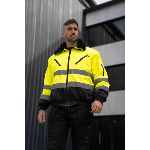 4-IN-1 PILOT JACKET 4 az 1-ben prémium pilóta dzseki mind a négy évszakra A gallér, az ujjak és a belső bélés levehető, így rugalmasan alakítható az időjárási körülményekhez Két darab 5 cm széles fényvisszaverő csík található a törzs körül és az