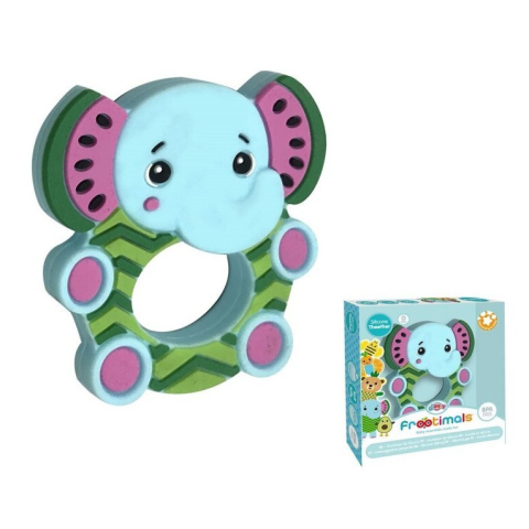 Frootimals, Elefánt baba rágóka - BPA mentes - 0 hónapos kortól - microba és mosogatógépbe is rakható 220°C-ig Puha műanyagból készült rágófelület, mely enyhíti a fogzás következtében előforduló fájdalmat. Kellemesen hűsíti és masszírozza az ínyt.