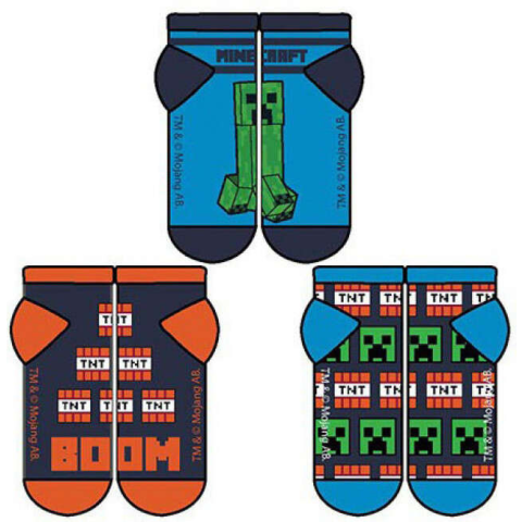 Minecraft gyerek titokzokni Az ár 3 pár zoknira vonatkozik! Anyaga: 70% pamut + 28% poliészter + 2% elasztán. 3 féle minta! Méret: 27/30