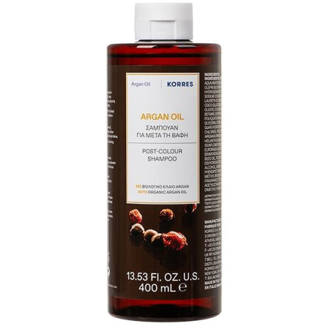 Sampon - hagyományos sampon, festett hajra ajánlott, növekedést serkentő, dúsító, hidratáló és mélytisztító hatás, 2in1 (sampon + balzsam), szilikonmentes és szulfátmentes, 400 ml-es kiszerelésben, luxus kozmetikum, természetes sampon A KORRES Argan Oil Post-Colour sampon legfontosabb tulajdonságaiHajfestés utáni samponArgánolajat, jojobaolajat és E-vitamint tartalmazHatékonyan szelídíti a rakoncátlan hajatMegakadályozza a hajszín