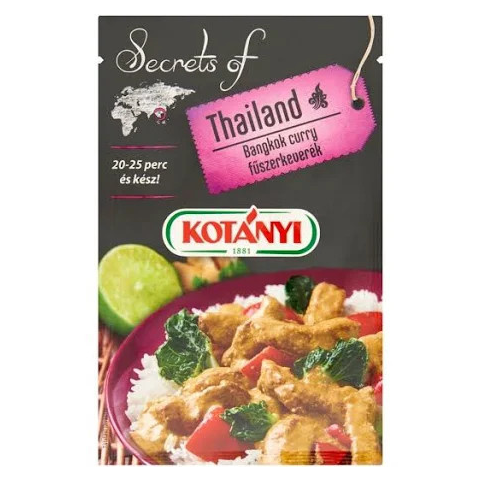 Kotányi bangkok curry 20 g Összetevők: petrezselyem, Jódozott étkezési só (étkezési só, kálium-jodid), vöröshagyma, fokhagyma, gyömbér, koriander, kardamom, chili, cayenne bors. A termék gluténtartalmú gabonaféléket, tojást, tejet (laktózt), zellert, s