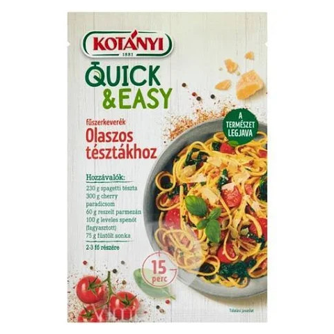Kotányi quick&easy fűszerkeverék olaszos tésztákhoz 20 g Ízgazdag egytálétel: A Kotányi Quick&Easy-vel csupán öt egyszerű hozzávalóra lesz szükséged, hogy egy igazán finom tésztás egytálételt varázsolj az asztalra. Összetevők: jódozott tengeri só (teng