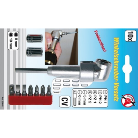 - Alkalmas sarokban lévő csavarok behajtásához- 6 db bit: csillag PH1-PH2, PZ1-PZ2, lapos 5-6 mm- 1 db 1/4 bit adapter- 2 db dugókulcs: 8-10 mm