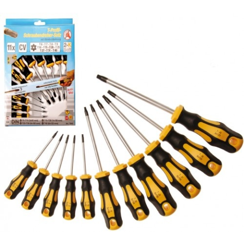 Króm-vanádium acélból készül; Matt króm bevonat; Fekete csavarhúzó fej; Ergonomikus, két komponensű markolat; Akasztó lyukkal. Tartozékok: T6-7-8-9-10-15-20-25-27-30-40 Megj.: a T6 és T7-es fejek nem fúrtak