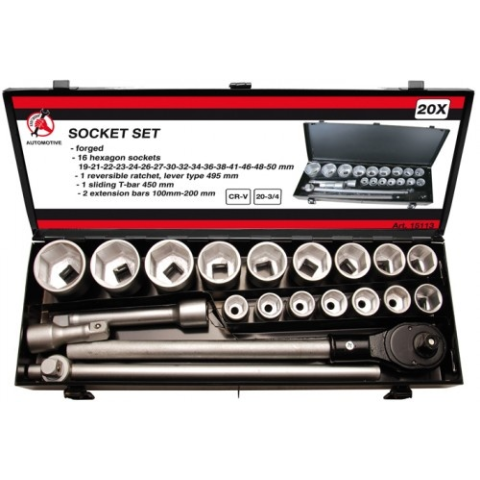 Króm-vanádium acélból készül kovácsolással;Matt króm bevonat;Fém tartódobozban.A következő 3/4-os szerszámokat és eszközöket tartalmazza:1 db racsnis hajtószár: 495 mm-es hossz1 db csúszó hajtószár: 450 mm-es hossz2 db hosszabbító szár: 100 és 200 mm1